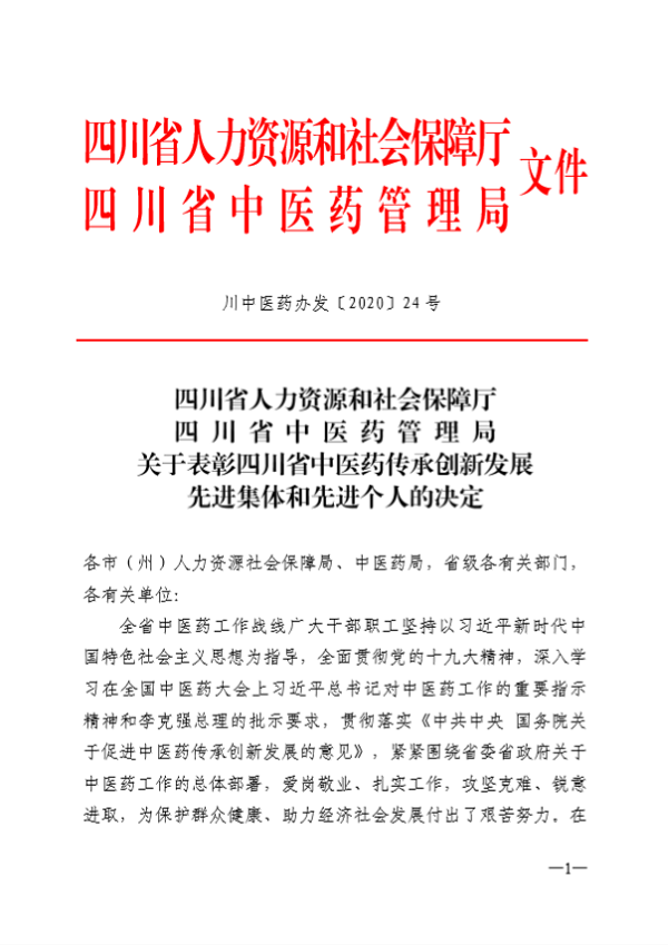 關(guān)于表彰四川省中醫(yī)藥傳承創(chuàng)新發(fā)展先進(jìn)集體和先進(jìn)個(gè)人的決定