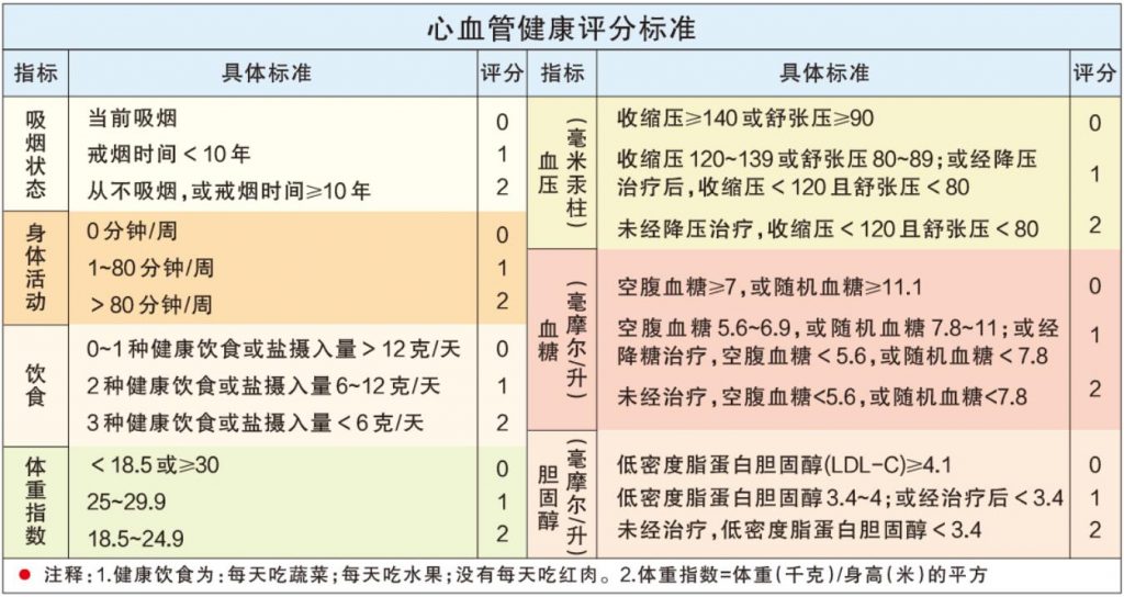 在《中華醫(yī)學(xué)雜志(英文版)》上,華中科技大學(xué)同濟(jì)醫(yī)學(xué)院等機(jī)構(gòu)的研究人員曾針對理想心血管健康與中國成年人死亡風(fēng)險降低的關(guān)聯(lián)進(jìn)行研究,根據(jù)近20萬人的健康數(shù)據(jù)分析得出,不論個人當(dāng)前的醫(yī)學(xué)因素和生活行為是怎樣的,只要盡早以健康的生活行為和良好的心臟代謝狀況為目標(biāo)采取措施,就可以減少過早死亡。他們還提出了適合評估國人心血管健康的評分標(biāo)準(zhǔn)(如圖),總分為0~6分,代表心血管健康水平不良,7~9分為中等水平,10~14分為理想水平。