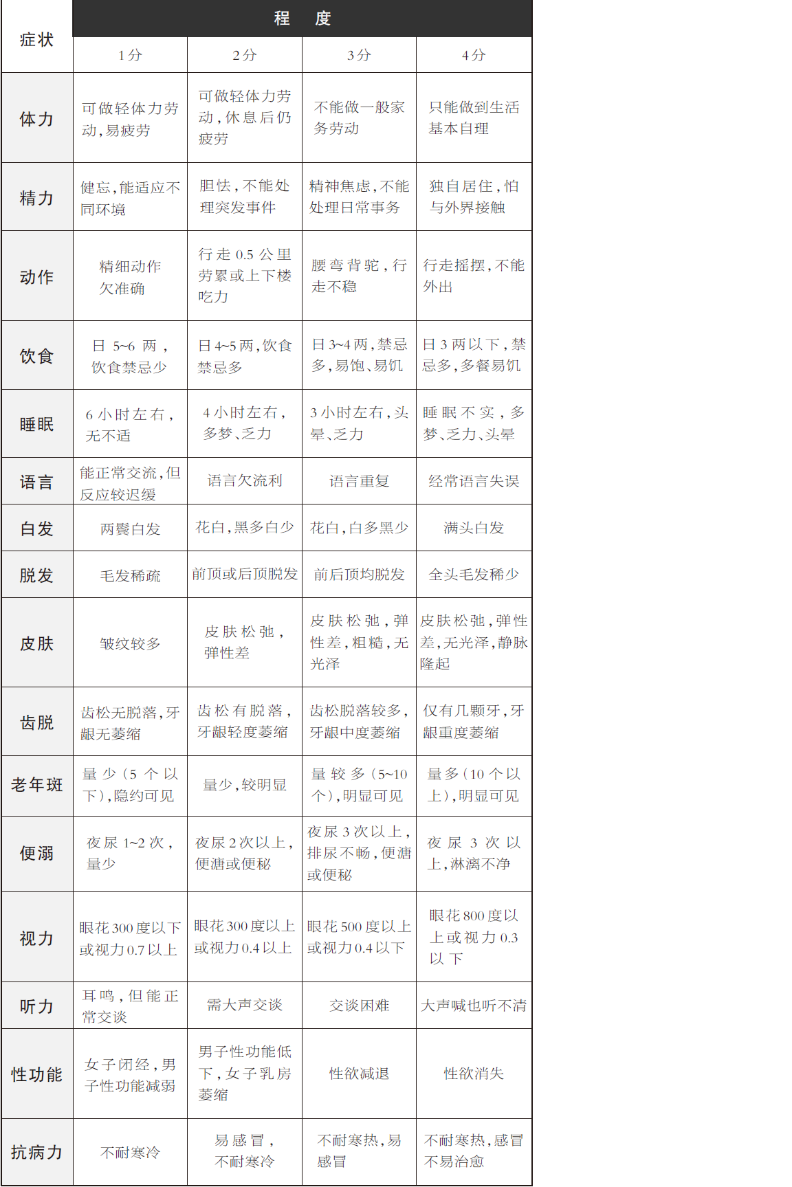 衰老會(huì)帶來一系列變化,準(zhǔn)確判斷自己的衰老程度,能讓老人更安全、有效、科學(xué)地健身,從而達(dá)到延緩衰老、增加活力的目的。本書中的表格共有16項(xiàng)指標(biāo),通過評估老人的肌肉力量、皮膚狀態(tài)、平衡能力、心肺功能、認(rèn)知能力等方面,將衰老程度量化為具體分?jǐn)?shù),由輕到重分為1~4分,總分最高是64分。老人自測時(shí),可將自己的情況與表中的描述一一對應(yīng),并進(jìn)行打分。若總分達(dá)30分以上,則表明身體已進(jìn)入老年期,總分越高衰老程度越重。