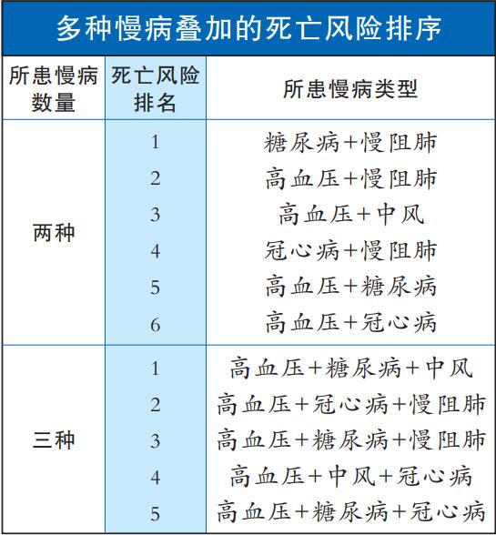“共病”更是加劇了慢病威脅。6月5日,鄭州大學(xué)公共衛(wèi)生學(xué)院發(fā)表的一項對5萬名65歲及以上中國人的研究發(fā)現(xiàn),多發(fā)慢病與全因死亡率呈正相關(guān)。與沒有慢病的參試者相比,具有1、2和3種慢病者全因死亡率分別增加45%、72%和115%(死亡風(fēng)險排序見圖表)。此外,吸煙飲酒、體重過輕、運動不足的人死亡風(fēng)險較高。
